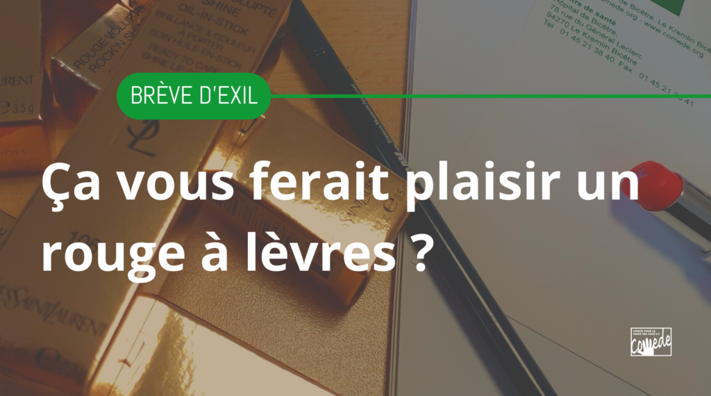 Ce n’est pas seulement du rouge à lèvres, c’est le petit élément qui a permis à cette maman exilée de dire en consultation « vous savez quand j’étais adolescente je voulais faire mannequin, j’adorais me mettre en mini-jupe, j’adorais poser et me maquiller mais mon frère n’a pas voulu, et j’ai été mariée très jeune ». Ensemble nous avons travaillé cette envie encore présente. Elle a participé à un beau projet collectif de mise en lumière des personnes trop souvent invisibles en posant pour un photographe professionnel. Aujourd’hui elle montre très fièrement ses portraits, certes un peu plus ridés qu’à 15 ans, mais avec une détermination incroyable dans le regard. Elle a enfin pu réaliser son rêve d’adolescente et rencontrer des nouvelles personnes.