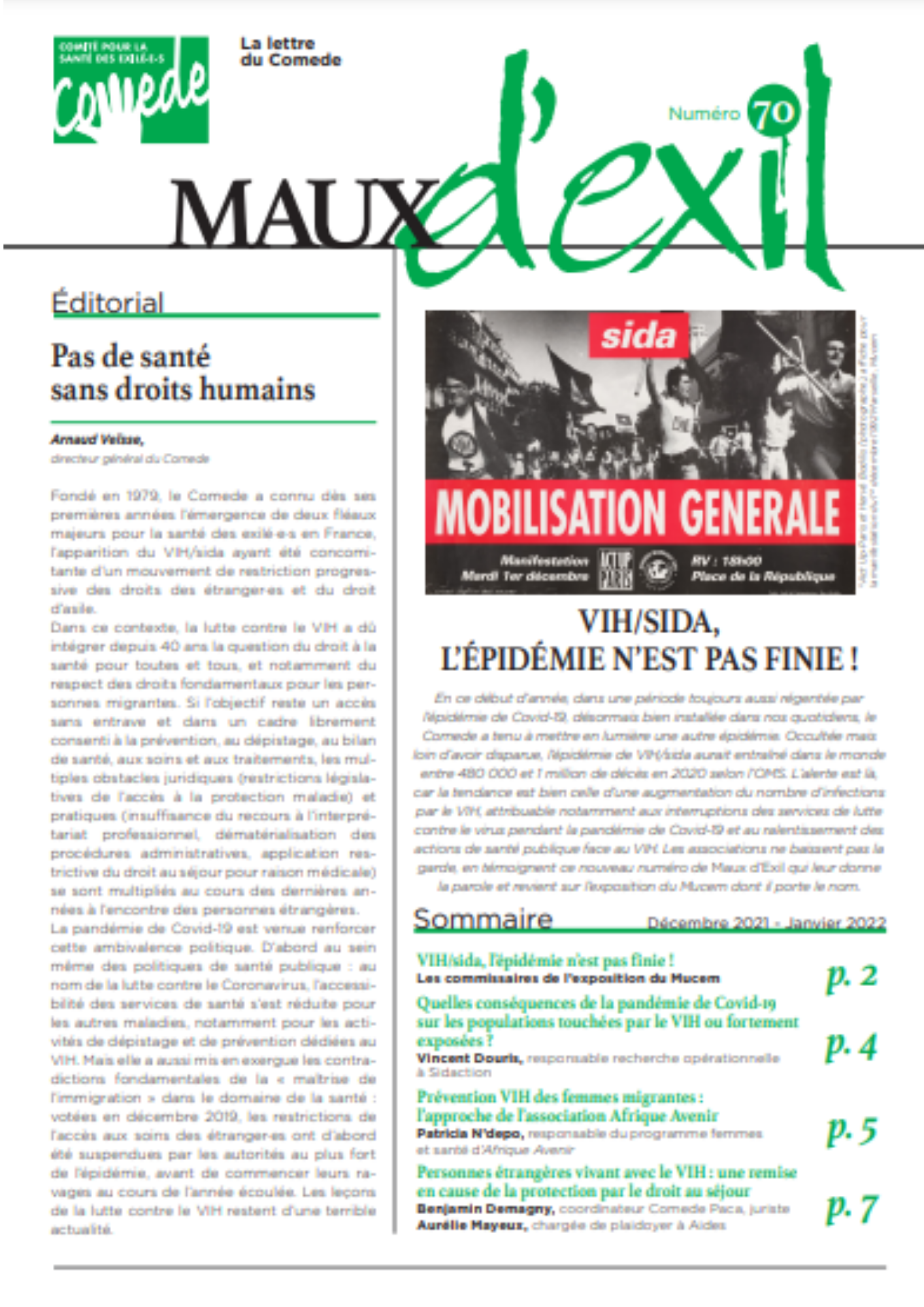 En ce début d’année, dans une période toujours aussi régentée par l’épidémie de Covid‑19, désormais bien installée dans nos quotidiens, le Comede a tenu à mettre en lumière une autre épidémie. Occultée mais loin d’avoir disparue, l’épidémie de VIH/sida aurait entraîné dans le monde entre 480 000 à 1 million de décès en 2020 selon l’OMS. L’alerte est là, car la tendance est bien celle d’une augmentation du nombre d’infections par le VIH, attribuable notamment aux interruptions des services de lutte contre le virus pendant la pandémie de Covid‑19 et au ralentissement des actions de santé publique face au VIH. Les associations ne baissent pas la garde, en témoignent ce nouveau numéro de Maux d’Exil qui leur donne la parole et revient sur l’exposition du Mucem dont il porte le nom.