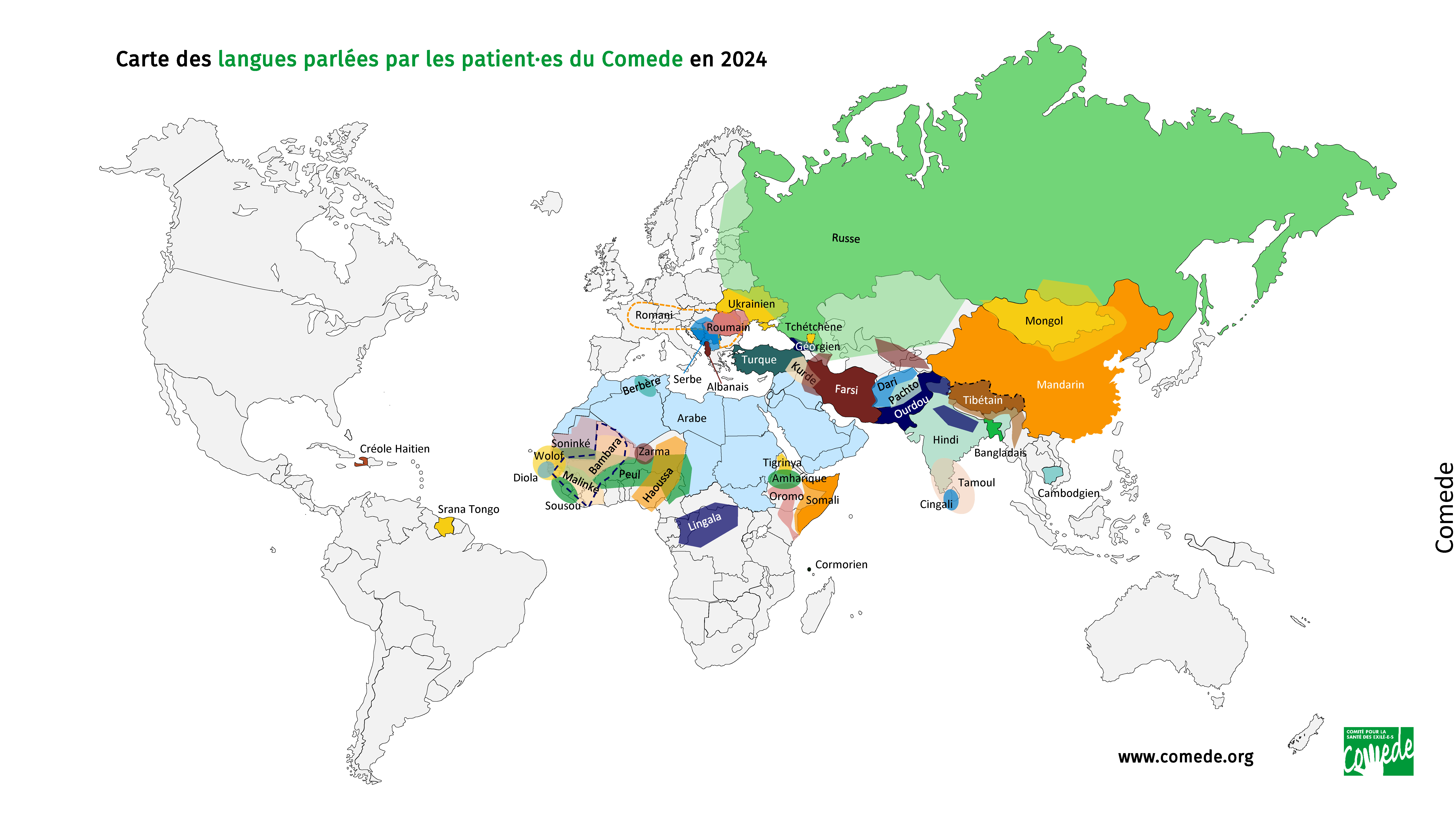 - Carte des langues parlées par les patient-es du Comede en 2024